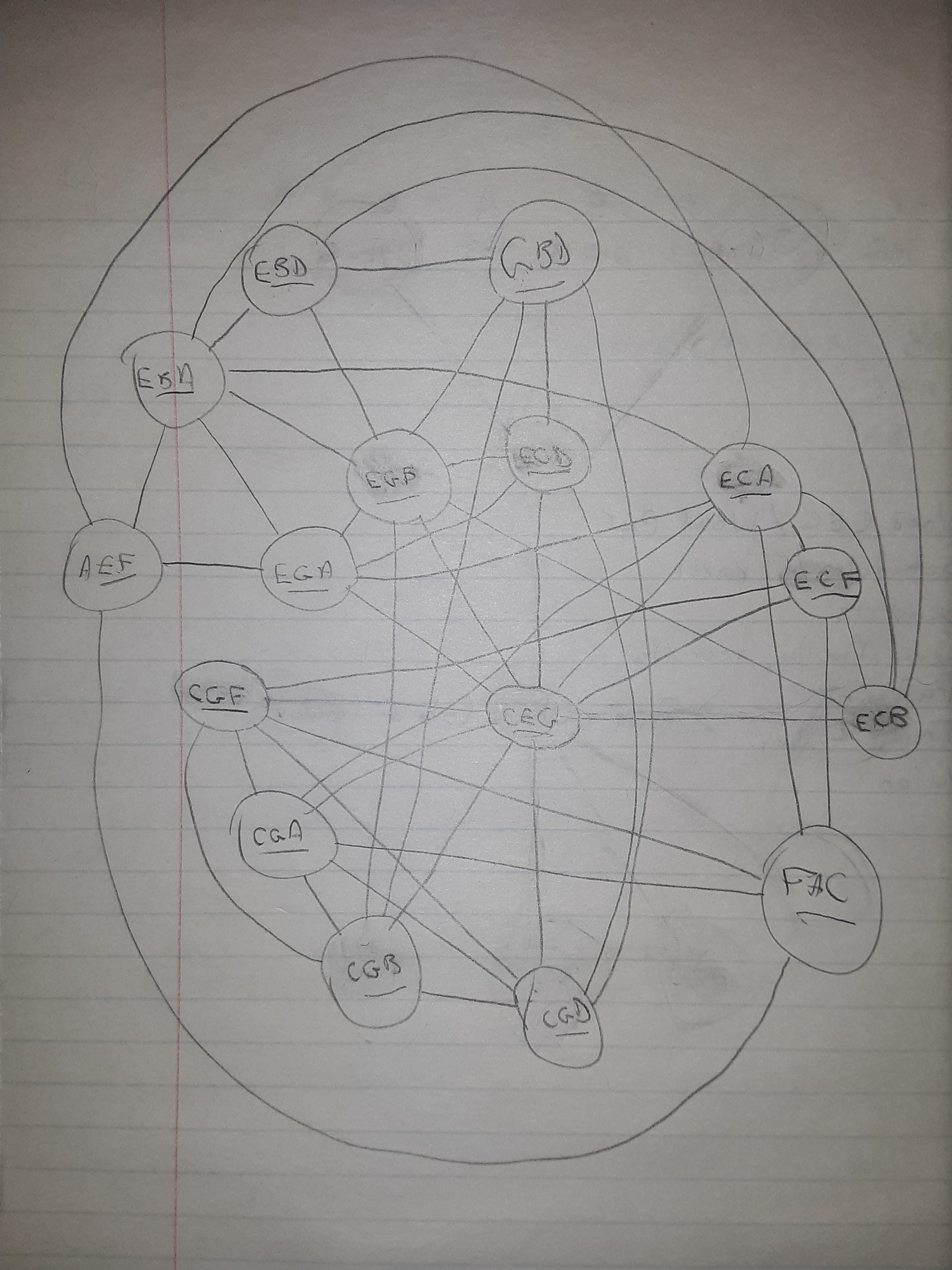 A doodle of mine to help organize my thoughts. Here, each “edge” in the graph connects “vertices” that represent a triad. The triads do not represent every possible set of 3 notes, but they do represent every possible set of 3 notes where every note is “consonant” with at least one other note in the set, in the sense of being a perfect fourth or fifth, or a major or minor third (or major/minor sixth as you choose octaves). This is a very limited view of “consonant” but it’s a place to start. One can also think of this as being based on the 5-limit major scale. In this context, tracing paths through this graph shows possible harmonic progressions where each changes by exactly one note. If you manage to path through every possible edge exactly once, this is an Eulerian path. If you path through every possible vertex exactly once and end where you start, this is a cycle.